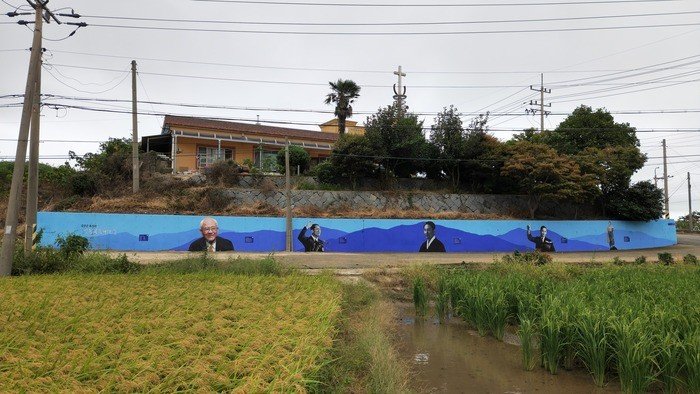 ‘스토리가 있는 김준곤 목사 벽화’는 김 목사가 1951년 4월 15일 첫 복음전파로 시작된 봉리교회에서 생가로 진입하는 길 우측 담벼락에 폭 36.5미터와 높이 1미터65센티미터로 제작된 대형 벽화다.