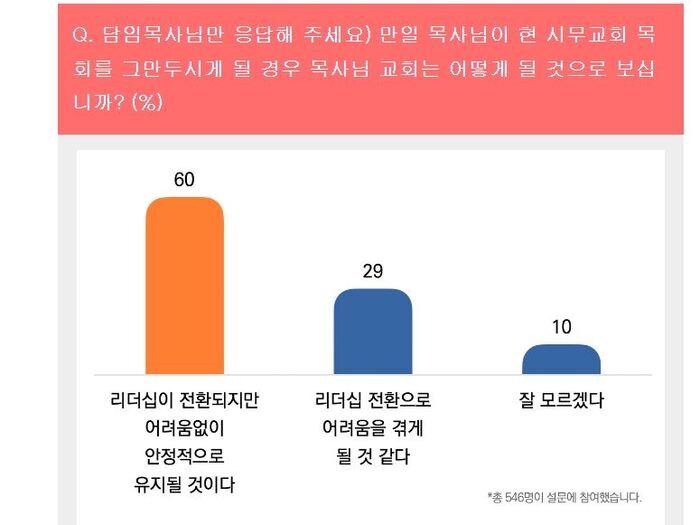 ‘리더십 전환으로 어려움을 겪을 것’이라는 응답은 30%였다. ‘잘 모르겠다’ 는 10%였다. 이같은 조사 결과는 담임목사 은퇴시 후임목사의 교회 적응에 대한 전임 목사들의 협력이 무척 중요하다는 것을 보여주는 조사 결과다.