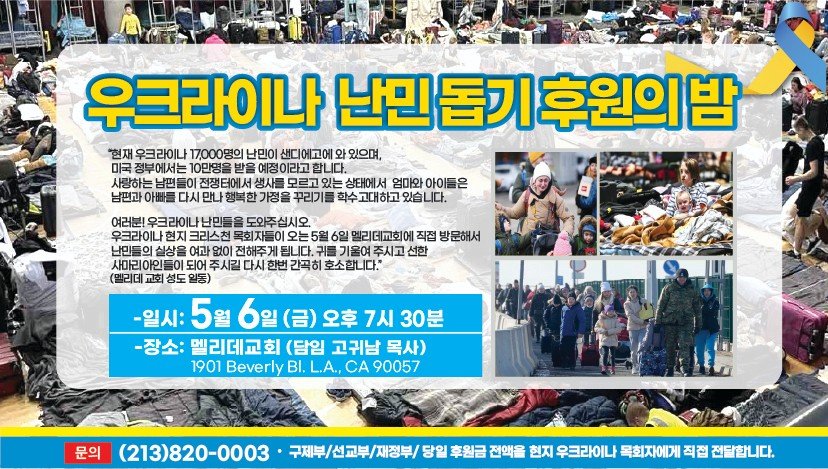 세계예수교장로회 WPC 미주서부노회 멜리데교회(1901 Beverly Blvd. 고귀남 목사)에서는 5월 6일 금요일 오후 7시 30분 고통당하고 있는 우크라이나 난민 돕기 후원의 밤을 가진다고 했다.