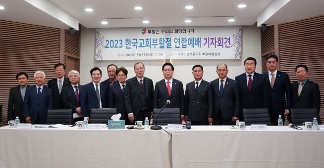 2023 한국교회부활절 연합예배 기자회견을 마치고 기념촬영하고 있다.