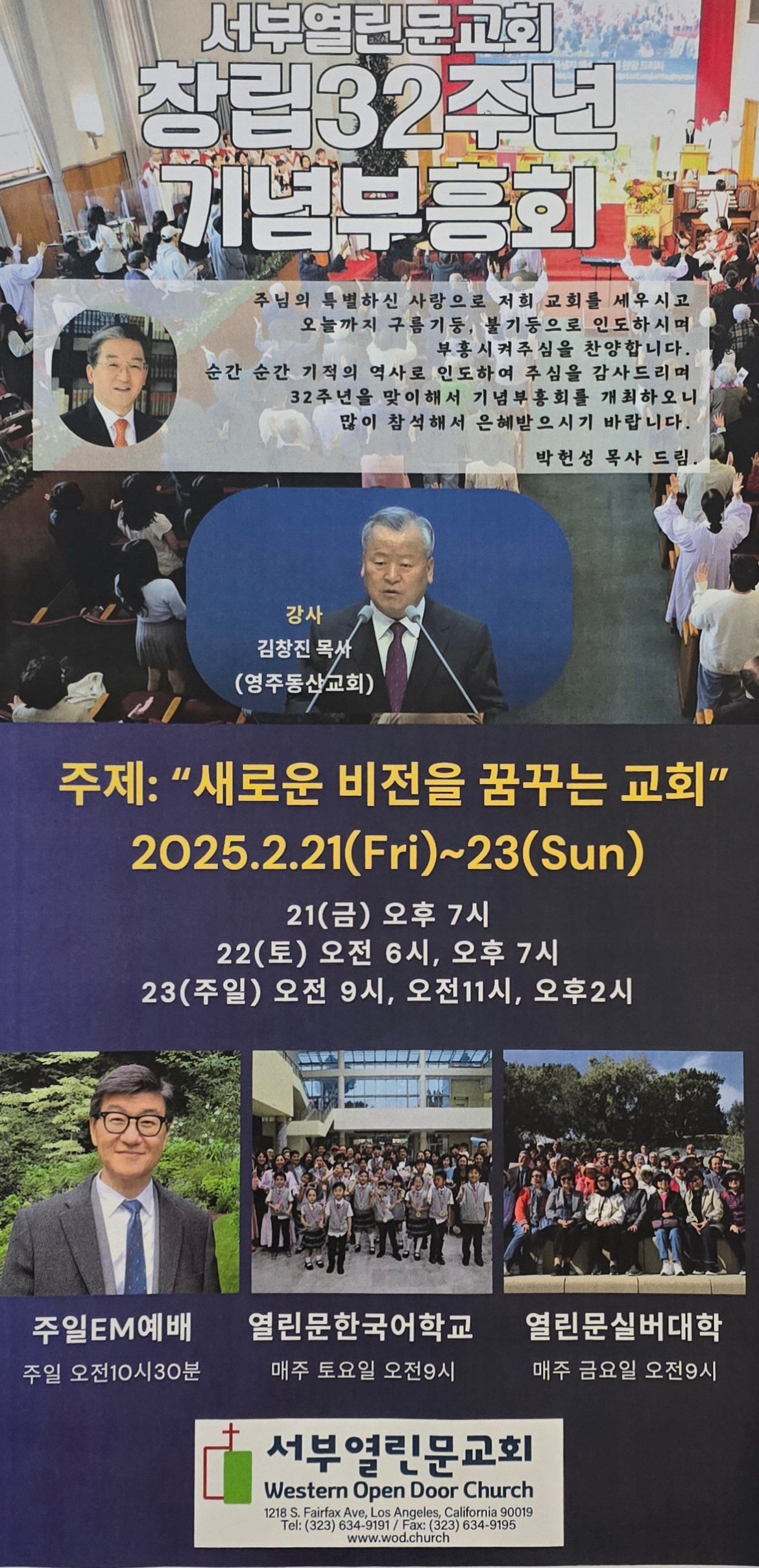 뉴스 서부열린문교회…“창립32주년 기념 부흥회” By web-manager February 20, 2025 인기 칼럼 대부분의 팔레스타인인들 …“하마스의 이스라엘 공격 잔혹성 부인” May 13, 2025 [박헌승 목사 칼럼] “겨우살이 준비” November 5, 2023 [황현조 박사 칼럼] “종교개혁과 이신칭의 신학” November 3, 2023 [박헌승 목사 칼럼] “카이로스의 몸부림” October 29, 2023 web-manager 주제 “새로운 비전을 꿈꾸는 교회” 2월 21(금) 오후 7시부터 23일(주일) 강사 ‘김창진 목사(영주동산교회)’ TagsLA서부열린문교회창립32주년 Share FacebookTwitterPinterestWhatsApp Previous article美 남장로교 첫 의료선교사…“드류 부부 유해 송환 결정”Next article예장합동, 군목강도사고시…“10명ㆍ영어고시 4명 ‘전원 합격’” - Advertisement - 관련 아티클 [북앤북스] 신간도서 September 20, 2025 이라크 기독교인들…“ISIS로부터의 피난처 10주년 기념” September 19, 2025 예장백석…“목회자 정년 사실상 없애” September 19, 2025 최신 뉴스 [북앤북스] 신간도서 September 20, 2025 이라크 기독교인들…“ISIS로부터의 피난처 10주년 기념” September 19, 2025 예장백석…“목회자 정년 사실상 없애” September 19, 2025 남가주교협 …“사랑의 쌀 나누기 ‘당신과 함께 합니다’” September 19, 2025 페이스페스트 신앙축제 …“33미터 높이 십자가 앞에 수 만명 결집” September 17, 2025 태아와 여성 보호 위한…“‘태아·여성보호국민연합’ 공식 출범” September 17, 2025 예장합동…“총회 이단백서〈주의하라 분별하라〉출간” September 17, 2025 찰리 커크가 남긴 믿음의 유산 …“수많은 영혼 주님 품으로 돌아오고 있어” September 16, 2025 예장백석…“신임 김동기 총회장 취임 감사예배” September 16, 2025 “CGI 자카르타 세계교회성장대회 성료” September 16, 2025 [예장합동 총회장 메시지] ‘성평등가족부’ 명칭 철회와 헌법가치 수호 촉구한다 September 16, 2025 열린문실버대학…“2025 가을학기 개강예배” September 15, 2025 예장합동 총회준비위 기도회…“ 성령 안에서 화합하고 선을 이루도록” September 15, 2025 뉴욕남성목사회 세미나…“현대교회 세속화 진단” September 15, 2025 [북앤북스] 신간도서 September 13, 2025