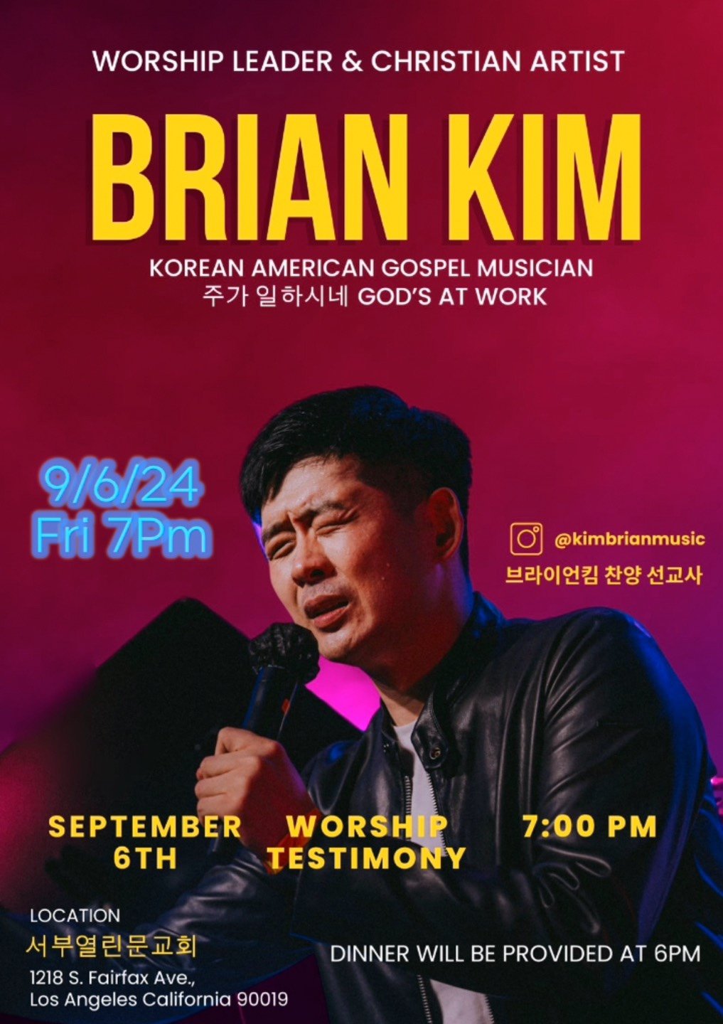 CCM ‘주가 일하시네’로 잘 알려진 찬양선교사 김브라이언과 함께하는 찬양 간증집회가 오는 6일(금) 오후 7시 서부열린문교회(박헌성 목사,1218 S. Fairfax Ave., LA) )에서 열린다.