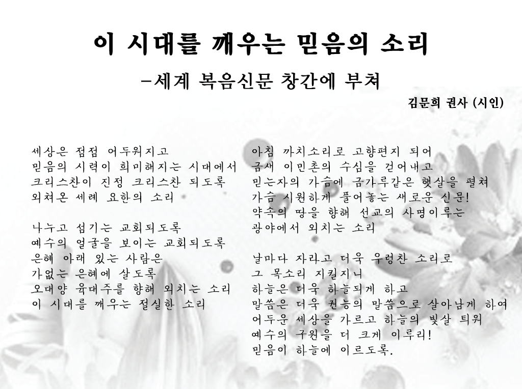 시인 김문희 권사는 1987년 ‘시문학’으로 등단하여 영랑문학상 미주펜 문학상등을 수상하였다. 시인은 시집으로 ‘눈뜨는 풀잎’ ‘가을강’ ‘길가에 밟히는 풀잎으로’ ‘깊어지는 마음’ ‘당신의 촛불 켜기’ ‘당신에게 가는 길’ 등이 있다. 그리고 수필집으로 ‘유럽 그 그리움의 거리’ ‘가난한 영혼들이 우수의 강을 지날때’ 시와 에세이집 ‘영혼을 적시는 실비’를 출간했다.