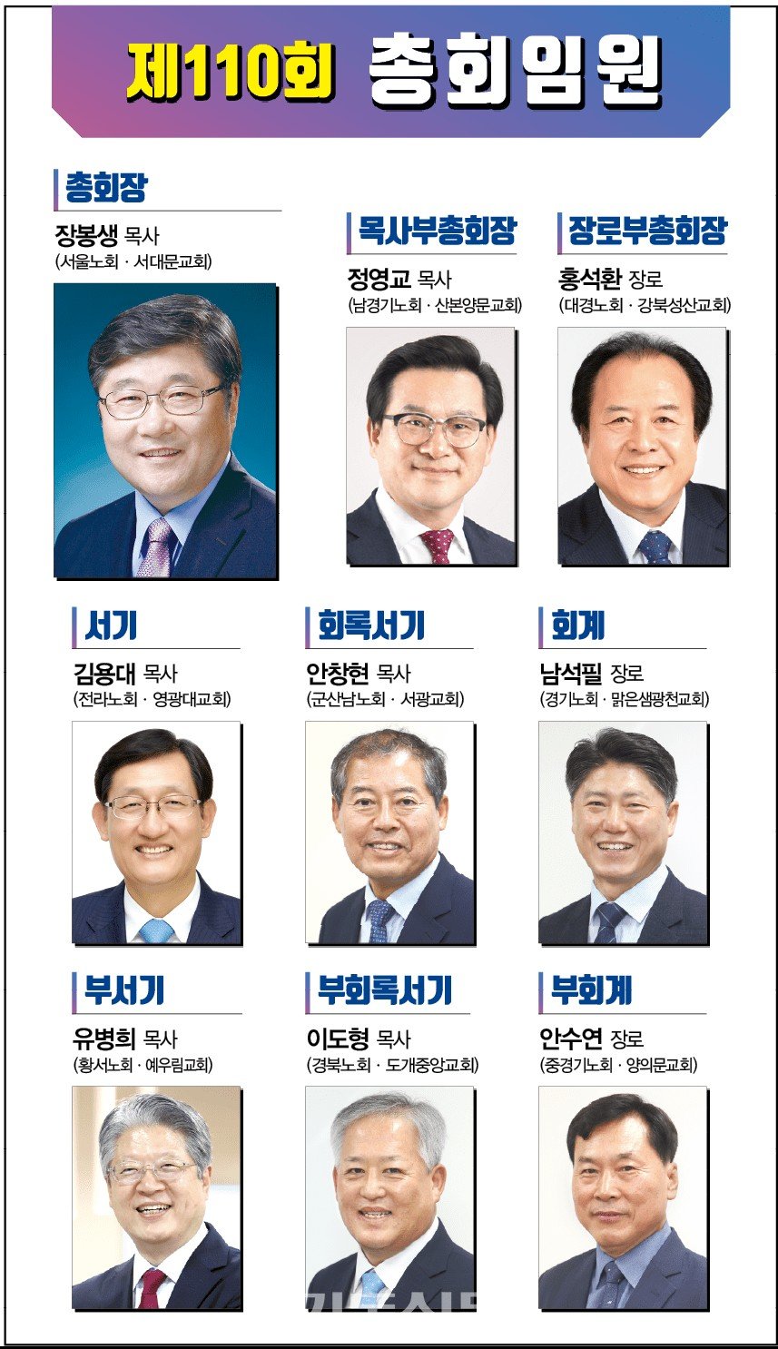 제110회 총회는 임원선거와 총대천서 문제로 첫날인 22일 총회임원선거를 진행하지 못했다. 혼동과 항의 속에 남경기노회 등 천서를 확정하지 못한 총대들이 천서를 받으며 총회는 정회했다. 23일 오전 회무를 속개했지만 총회임원선거 문제로 회의장은 더욱 혼란했다. 재차 정회한 끝에 총회선관위는 총회장 장봉생 목사를 비롯해 부총회장 홍석환 장로, 회록서기 안창현 목사, 부회록서기 이도형 목사, 회계 남석필 장로, 부회계 안수연 장로 등 총회임원 단독후보자들을 일괄 상정해서 당선을 공포했다.