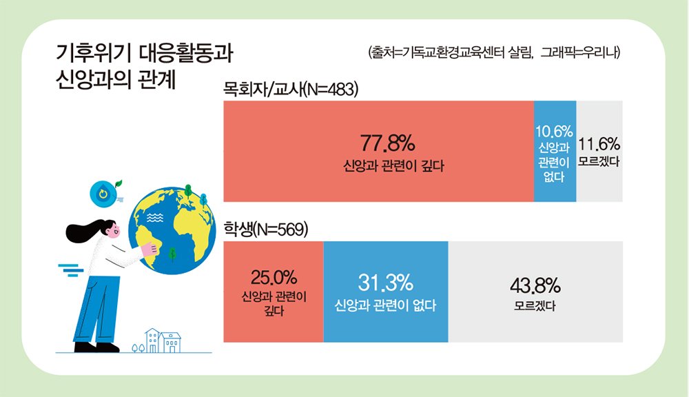 기후위기의 심각성을 인식하고 대응하기 위한 움직임이 전 세계적으로 분야를 막론하고 일어나고 있는 가운데, 교회 내 특히 다음세대를 교육하는 주일학교 현장에서는 어떤 노력을 기울이고 있을까? 기후환경 교육의 현 상태를 파악하고 미래 방향성을 설정하기 위한 ‘유·청소년 기후환경 인식과 행동’ 조사가 처음으로 실시돼 눈길을 끈다.